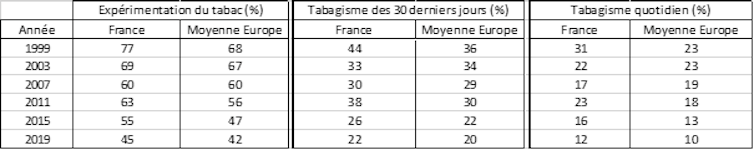 Depuis 1999, le tabagisme des jeunes diminue dans l’ensemble des pays d’Europe, avec une tendance à l’homogénéisation des comportements. C’est d’autant plus vrai pour la France, qui présentait au départ des niveaux plus élevés que la moyenne (Tableau I) pour l’expérimentation (77 % contre 68 %), le tabagisme mensuel (44 % contre 36 %) ou le tabagisme quotidien (31 % contre 23 %).